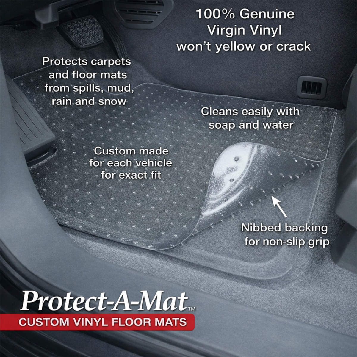 Protect-A-Mat™ Clear Vinyl Custom Floor Mats shield your OEM carpet mats from mud, moisture, salt, and daily grime—without covering up the color and style you already like. These crystal-clear mats are custom-tailored to your exact vehicle using digital CAD/CAM tech, so they fit cleanly and stay put.