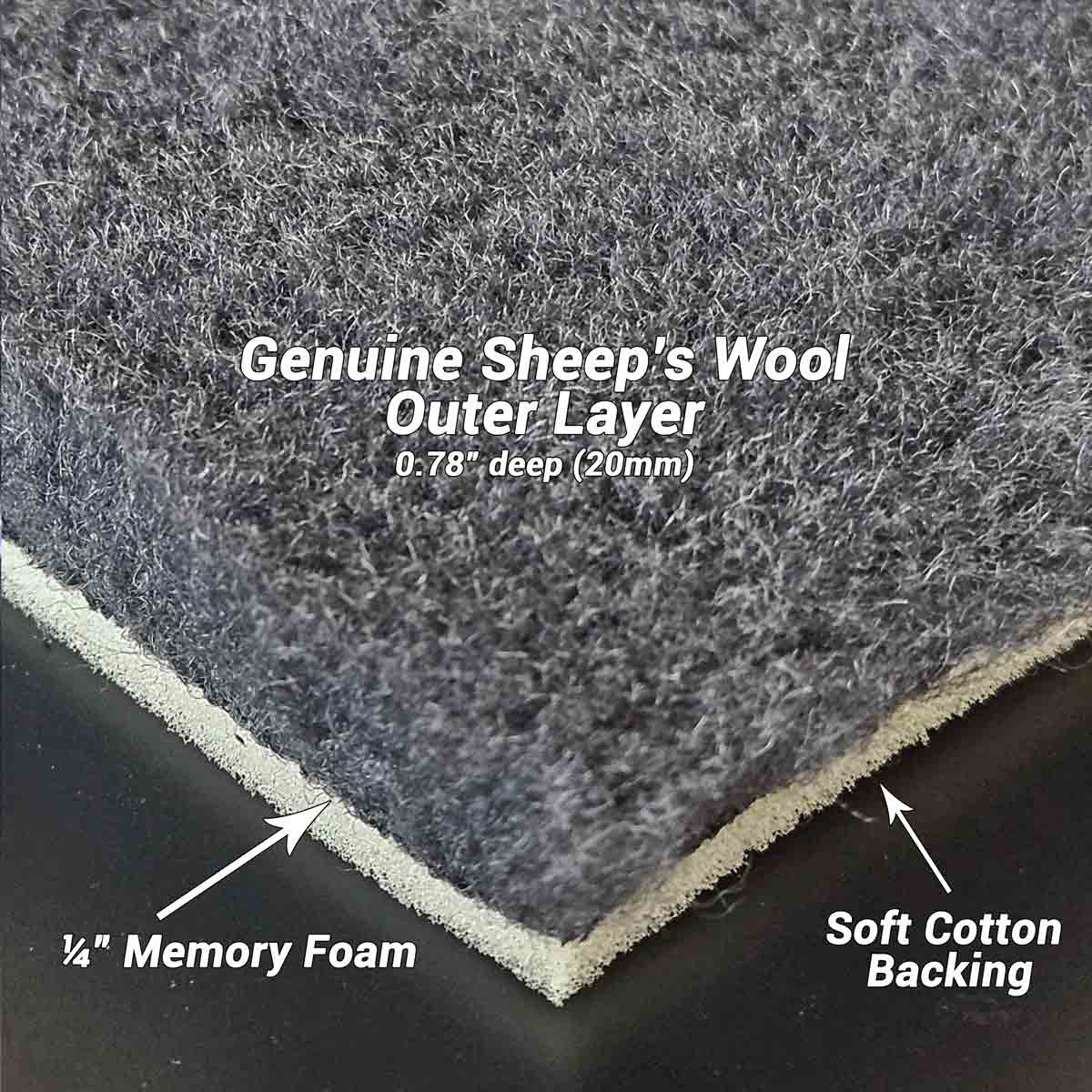 - Genuine sheep's wool with no leather hide backing (just a "haircut"); the shorn wool is then sewn into a woven backing
